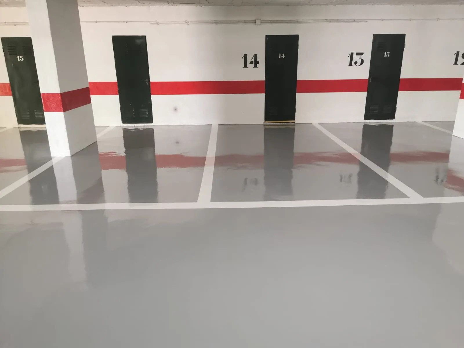 Aplicación para parkings y naves industriales con sistemas resistentes unicolor, incluyendo señalización vial, y acabados brillantes efecto cristal con opciones de diseño personalizado cuando se busca un resultado más visual y elegante.
